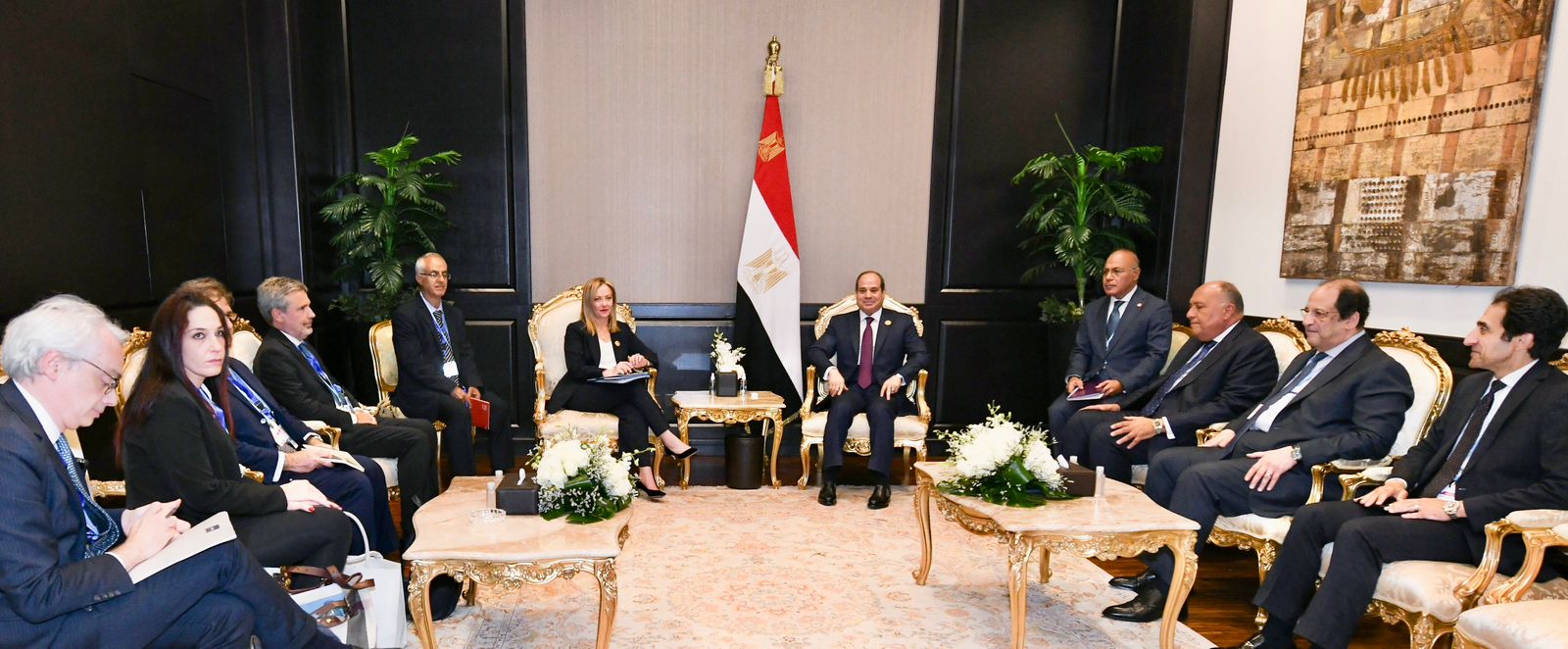 وصرح السفير بسام راضي المتحدث الرسمي باسم رئاسة الجمهورية بأن الرئيس رحب بزيارة رئيسة الوزراء الإيطالية ومشاركتها في أعمال قمة المناخ، مجددًا التهنئة على توليها مهام منصبها مؤخرًا، ومعربًا عن تقديره للعلاقات الثنائية الممتدة بين البلدين، وتطلعه لأن تمثل زيارة السيدة ميلوني إلى مصر قوة دفع جديدة لتطوير تلك العلاقات التي تستند إلى روابط تاريخية عميقة ذات أبعاد سياسية واقتصادية وأمنية وثقافية.