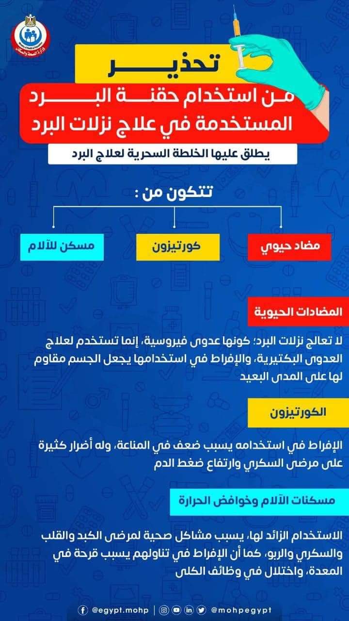 جددت وزارة الصحة التحذير من استخدام حقنة البرد في موسم الشتاء تزامنا مع تزايد الإصابات بالبرد والانفلونزا.