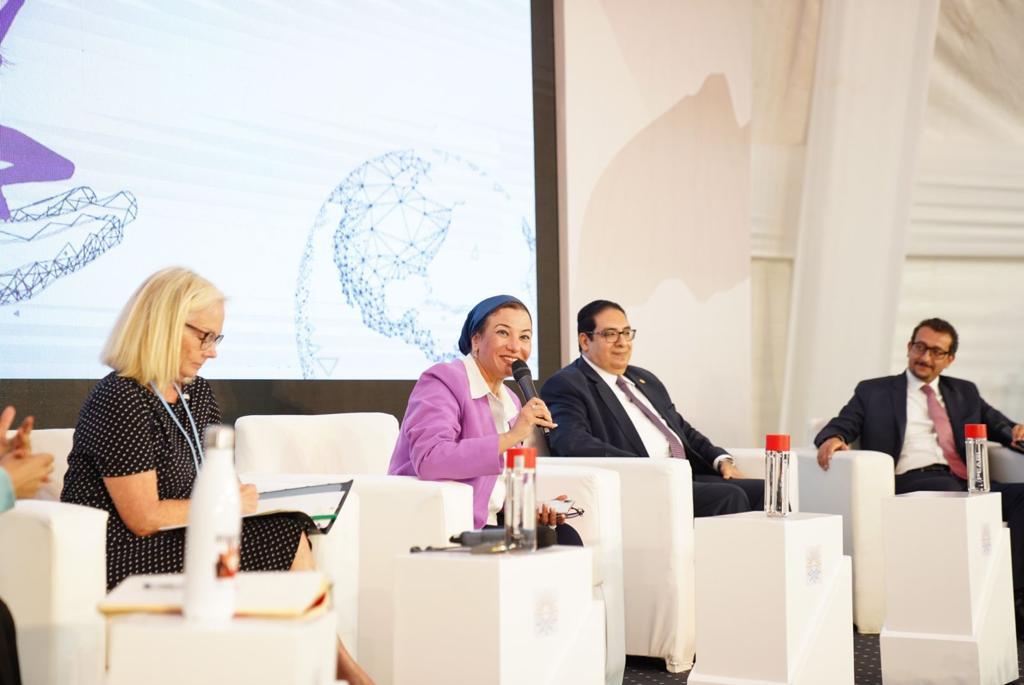 وأشارت وزيرة البيئة فيما يخص دور الشركات الناشئة العاملة على التحديات البيئية كجزء من استراتيجية مصر الوطنية لتغير المناخ ٢٠٥٠، أنها جزء أصيل من الاستراتيجية وخطة المساهمات الوطنية المحدثة وأيضا حزمة المشروعات الخاصة برابطة الطاقة والغذاء والمياه، وذلك من منطلق الإيمان بضرورة تسريع طريقة التفكير لتسريع التنفيذ، من خلال تغيير لغة الحوار والمفاهيم الراسخة، مسترشدة بقصة الطاقة المتجددة التي كان ينظر إليها منذ عدة سنوات في اجتماع باريس على أنها آلية مرتفعة التكلفة وتواجه صعوبات في نقل وامتلاك التكنولوجيا والانتقال إليها، واليوم ونحن نبحث الانتقال العادل للطاقة نجد أن في منطقة المتوسط وحدها، وصل عدد فرص العمل المقدمة في السنوات الثلاث الأخيرة من ١١ إلى ١٥ مليون وظيفة جديدة في هذا المجال.