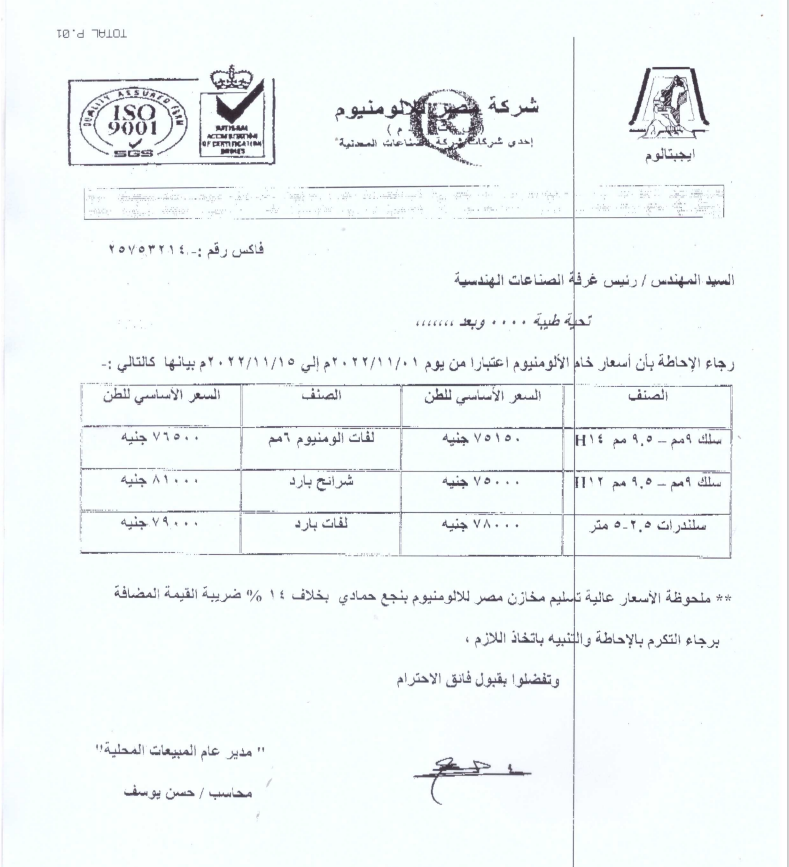 أعلنت شركة مصر للألومنيوم أسعار خامات الألومنيوم اعتبارا من بداية نوفمبر الجاري وحتى نهاية الشهر.