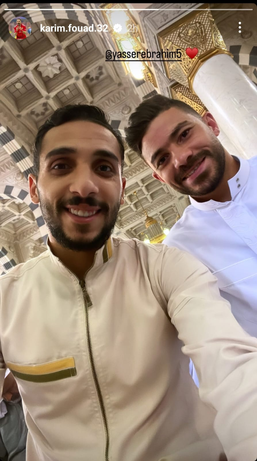 ونشر كريم فؤاد لاعب النادي الأهلي صورة عبر حسابه الشخصي على موقع التواصل الاجتماعي انستجرام جمعته بياسر إبراهيم زميله بالفريق ومحمد عبد المنعم خلال أدائهم مناسك العمرة في فترة الإجازة التى منحها الجهاز الفني للفريق الأحمر للاعبين في ظل فترة التوقف الدولي الحالية التى يخوض فيها المنتخب الوطني مباراة بلجيكا الودية المقرر إقامتها يوم 18 نوفمبر الجارى.