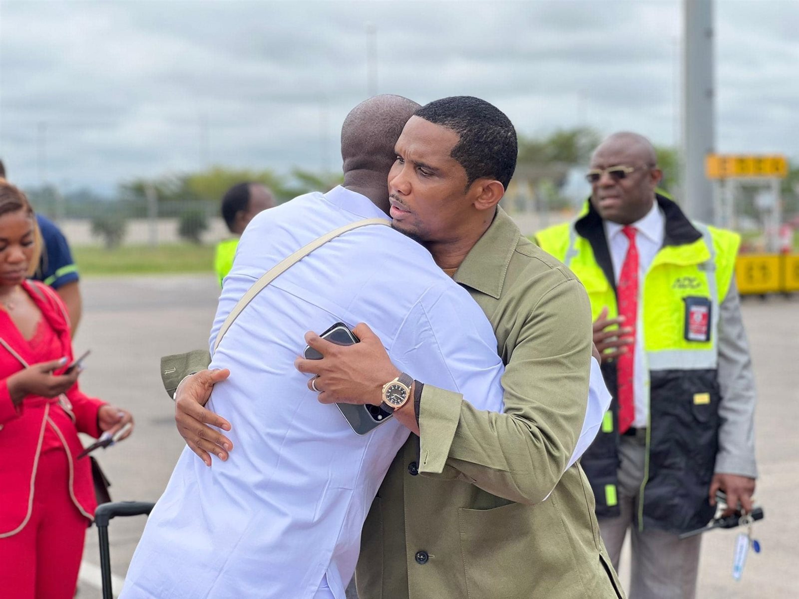 ظهر سونج المدير الفني لمنتخب الكاميرون بزي جلباب عربي خلال مغادرة بعثة منتخب بلاده إلى أبو ظبي لبدء معسكر إعداد قبل بداية كأس العالم بصحية الأسطورة الكاميرونية صامويل ايتو رئيس اتحاد الكرة الكاميروني.