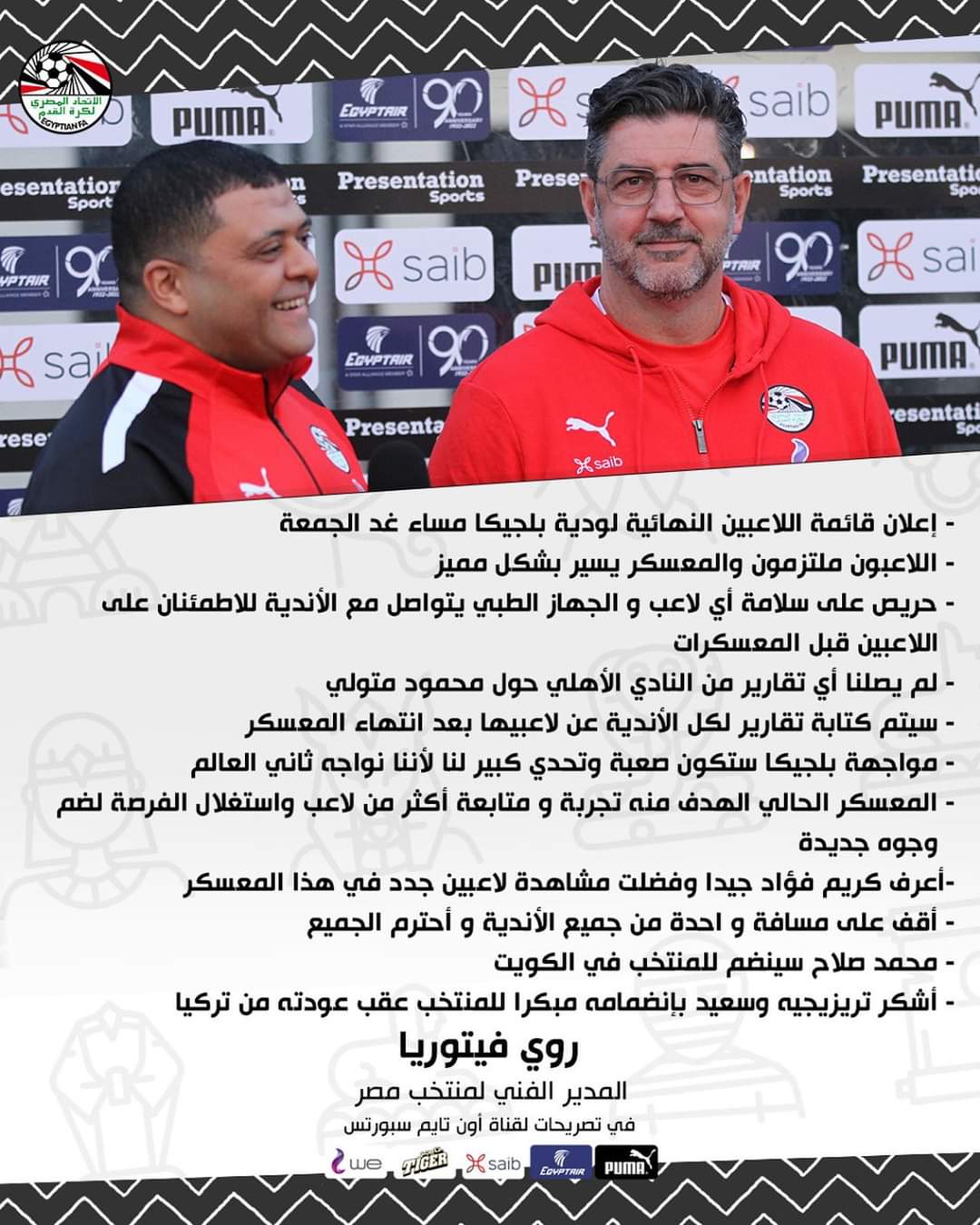 وتابع فيتوريا: "حريص على سلامة أي لاعب في قائمة المنتخب، والجهاز الطبي يتواصل مع الأندية للاطمئنان على اللاعبين قبل المعسكرات".