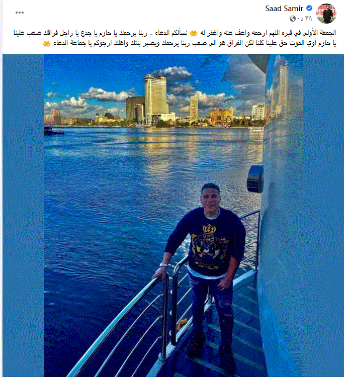 ونشر سعد سمير نجم الاهلي السابق دعاء مؤثرا لصديقه الراحل قائلا:"الجمعة الأولي في قبره اللهم ارحمه واعف عنه واغفر له نسألكم الدعاء.. ربنا يرحمك يا حازم يا جدع ".