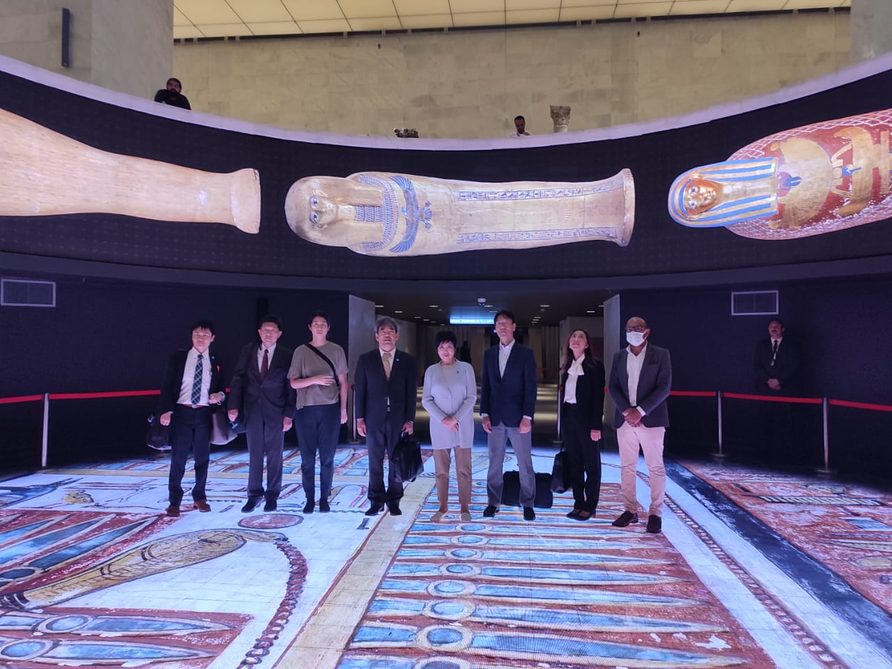 كما رافقهم سيد أبو الفضل المشرف على قاعة العرض المركزي وقاعة المومياوات الملكية، في جولة أثرية قدم خلالها شرحا تفصيليا عن المقتنيات الأثرية الفريدة للمتحف والتسلسل التاريخي لها، وسيناريو العرض المتحفي.