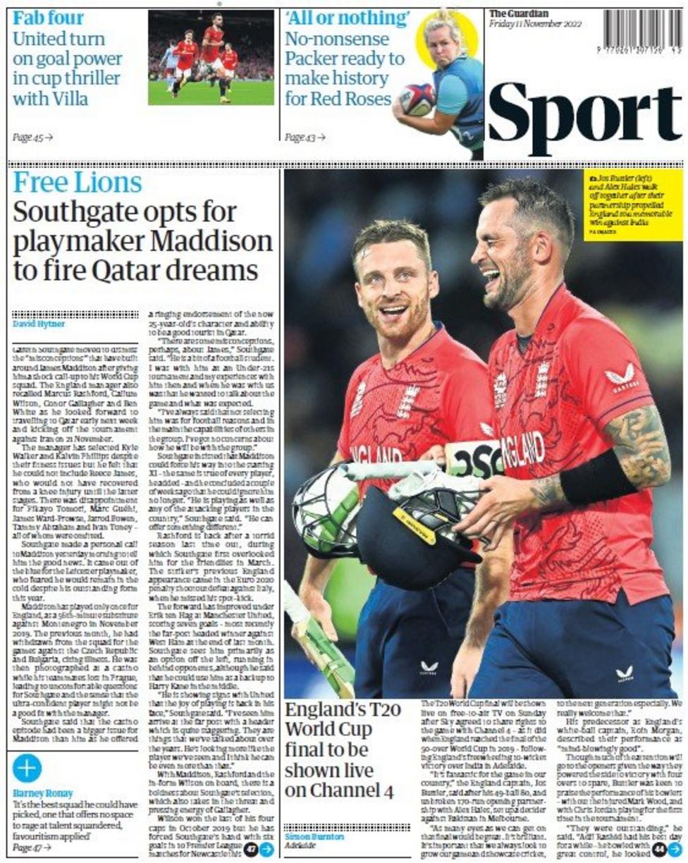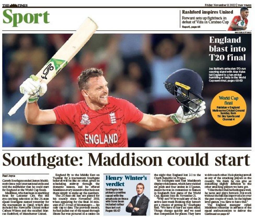كما كتبت صحيفة "التايمز": "ساوثجيت: ماديسون بإمكانه البدء"، وفي الأعلى كتبت: "راشفورد يلهم اليونايتد".