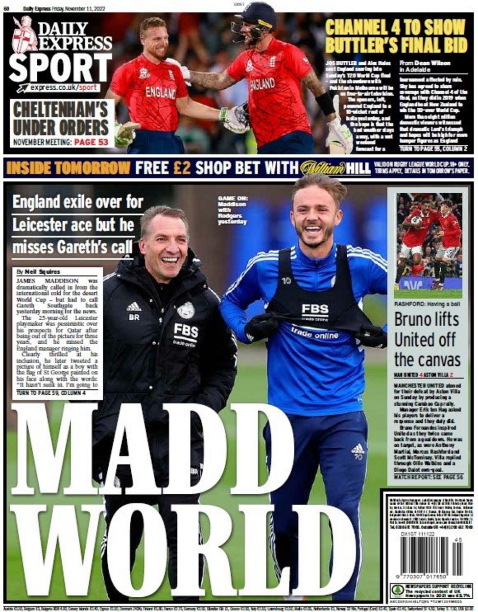 وعنونت صحيفة "ديلي إكسبريس": "انتهاء الاستبعاد لورقة ليستر الرابحة ولكنه فوت مكالمة جاريث"، في إشارة إلى ماديسون وعدم رده على مكالمة ساوثجيت الخاصة بضمه للمنتخب.