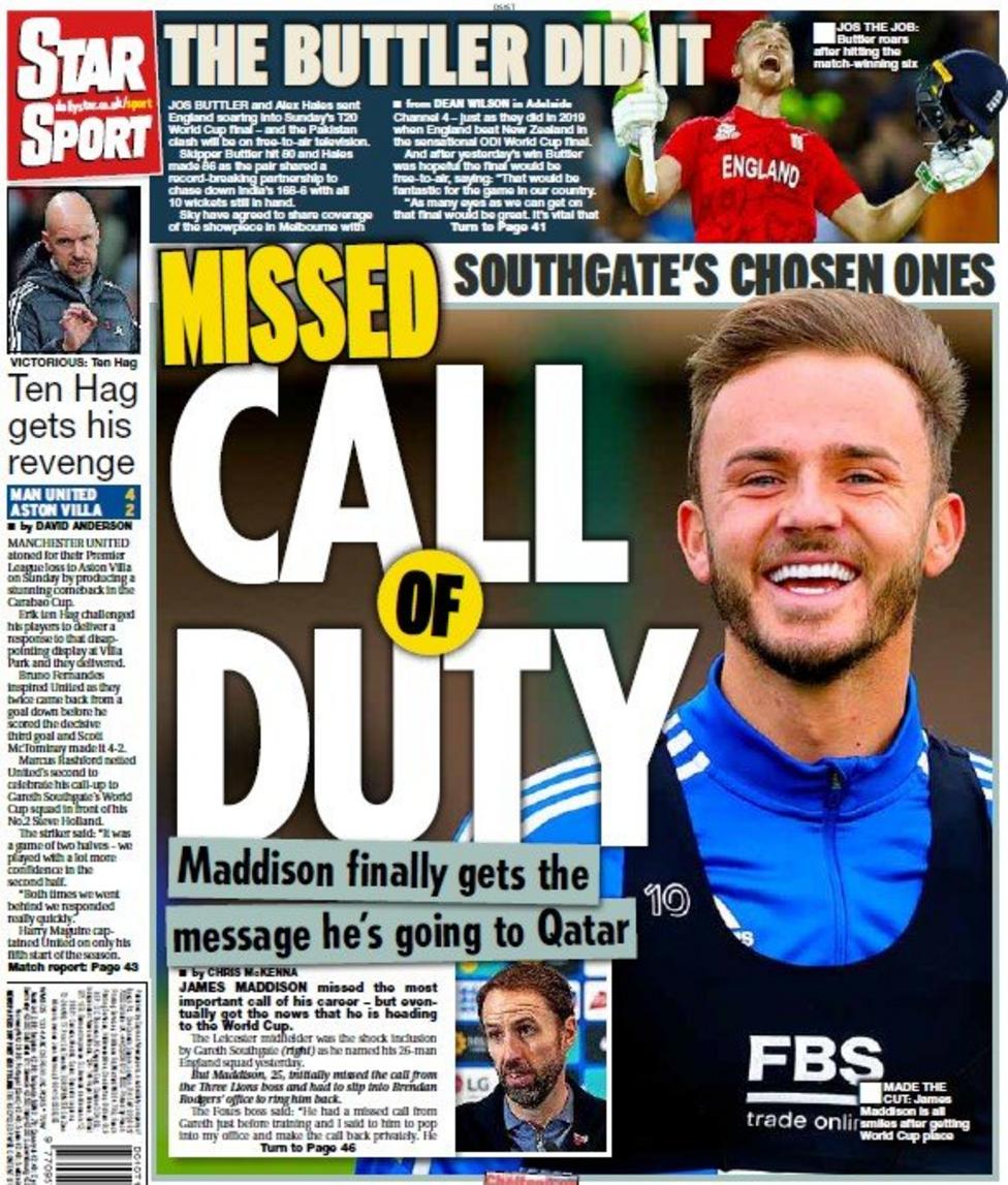 ومن جانبها عنونت صحيفة "ديلي ستار": "تفويت نداء الواجب.. ماديسون يحصل أخيرا على رسالة الذهاب إلى قطر".