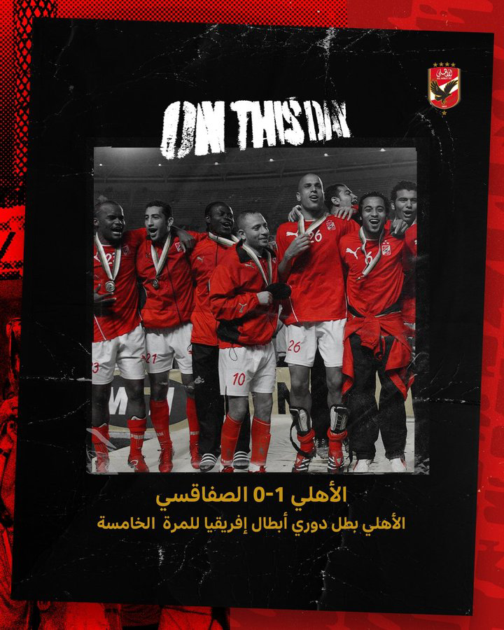 حرص الحساب الرسمي للنادي الأهلي عبر موقع التواصل الاجتماعي فيس بوك على الاحتفال بذكرى تتويج الفريق الأحمر بلقب دوري أبطال أفريقيا للمرة الخامسة في تاريخه الذي كان في مثل هذا اليوم الحادى عشر من شهر نوفمبر الجارى من العام 2006 عندما تغلب على فريق الصفاقسي التونسي بهدف نظيف في لقاء إياب الدور النهائي الذي أقيم على الملعب الاولمبي برادس بتونس العاصمة.