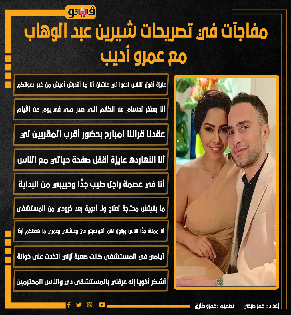 مفاجآت في تصريحات شيرين عبد الوهاب مع عمرو أديب | إنفوجراف السبت 12/نوفمبر/2022 - 12:59 ص 11/12/2022 12:59:04 AM شيرين عبد الوهاب وحسام حبيب عمر صبحي شارك طباعة 18 حجم الخط شارك طباعة شيرين عبد الوهاب النجمة شيرين عبد الوهاب ازمة شيرين عبد الوهاب حسام حبيب الفن