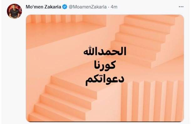 وكتب مؤمن زكريا عبر حسابه بموقع التواصل الاجتماعي "فيس بوك": "الحمد لله.. كورونا.. دعواتكم".