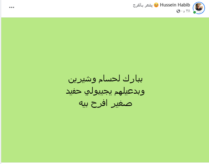 وقال "حبيب" على حسابه الشخصي بموقع التواصل الاجتماعى "فيس بوك": "ببارك لحسام وشيرين وبدعيلهم يجيبولي حفيد صغير أفرح بيه".