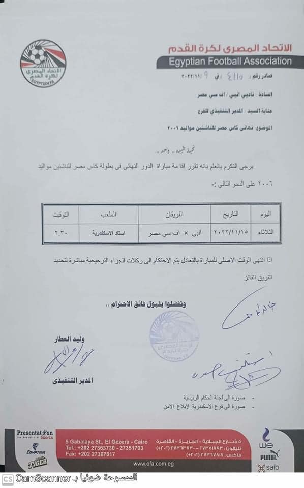 أعلن اتحاد الكرة عن موعد نهائي كأس مصر للناشئين مواليد 2006 بين نادي إنبي ونظيره زد.