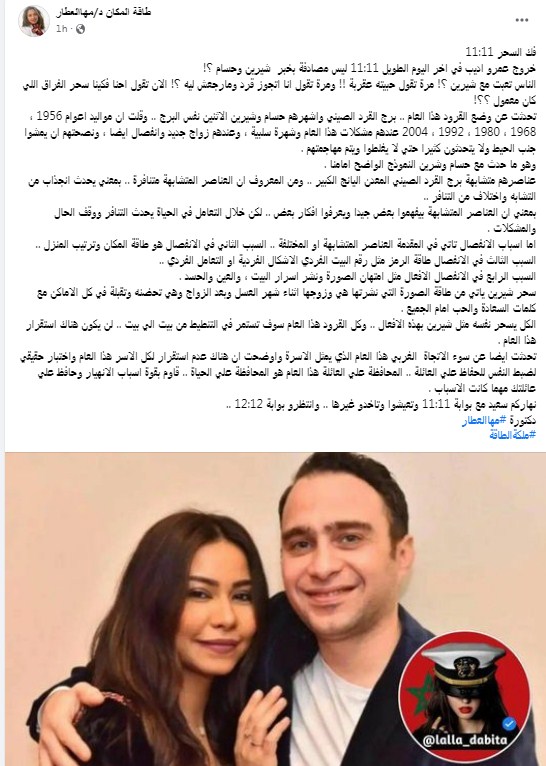 وعلقت خبيرة الطاقة على حديث لشيرين بعد عودتها لحسام عندما قالت "وكان معمولا لنا حاجة، والحمد لله ربنا فكهالنا"، في إشارة لأعمال سحر." قفالق مها: "فك السحر 11:11 خروج عمرو اديب في اخر اليوم الطويل 11:11 ليس مصادفة بخبر شيرين وحسام؟!"