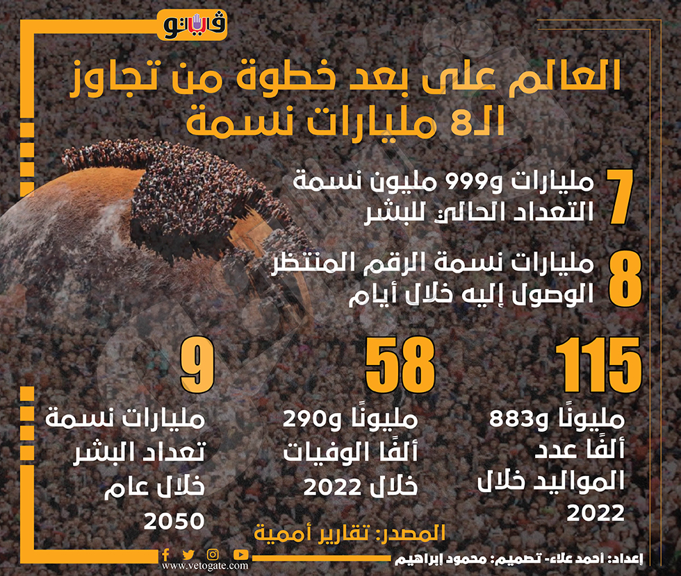 العالم على بعد خطوة من تجاوز الـ8 مليارات نسمة | إنفوجراف السبت 12/نوفمبر/2022 - 08:14 م 11/12/2022 8:14:52 PM سكان العالم احمد علاء شارك طباعة 18 حجم الخط شارك طباعة عدد سكان الأرض تعداد سكان العالم عدد المواليد عدد الوفيات