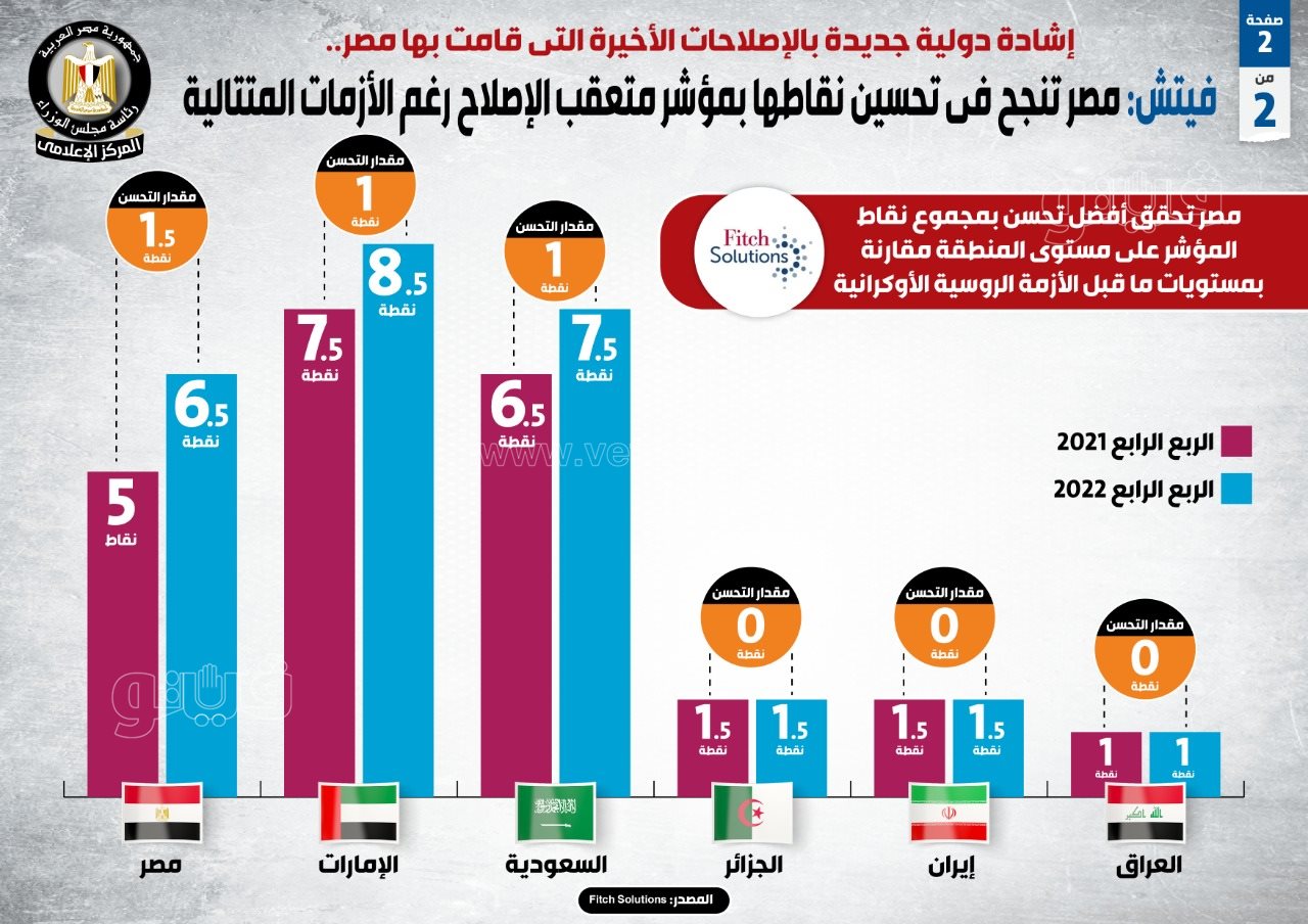 وفي هذا الصدد نشر المركز الإعلامي لمجلس الوزراء تقريرًا تضمن إنفوجرافات تسلط الضوء على إشادة فيتش بنجاح مصر في تحسين نقاطها بمؤشر متعقب الإصلاح، بفضل الإصلاحات الأخيرة التي قامت بها مصر، رغم الأزمات المتتالية.