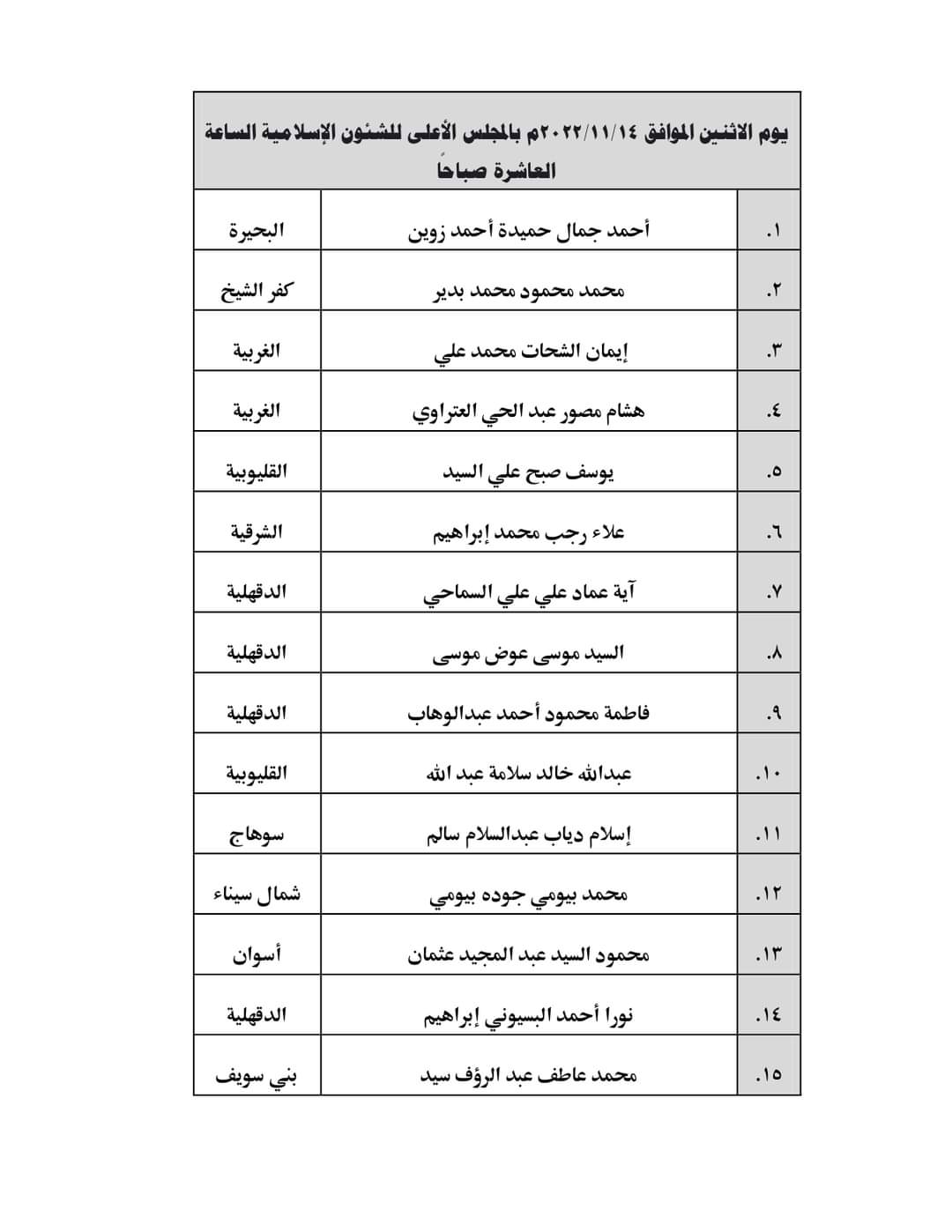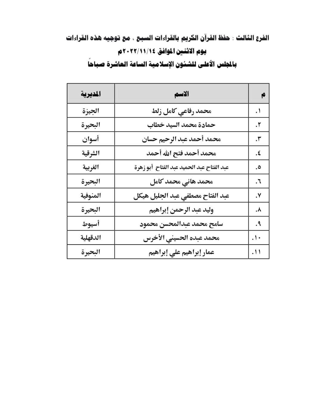 وأكدت وزارة الأوقاف أن الجوائز التشجيعية ستشمل بعض من نجحوا في الاختبار التحريري المركزي بنجاح ولم تؤهلهم درجاتهم للتصفية الشفوية النهائية، وسيتم الإعلان الكامل عن النتيجة والجوائز عقب انتهاء الاختبارات الشفوية وهم: