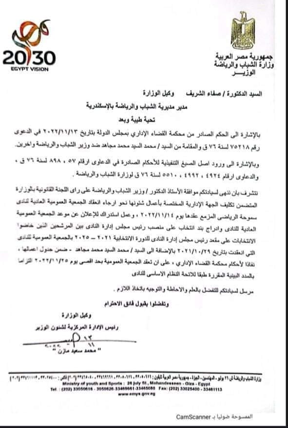 وأرسلت وزارة الشباب والرياضة خطابا إلى مديرية الشباب والرياضة بالإسكندرية، يفيد بتأجيل الجمعية العمومية التى كان مقررا لها غدا الإثنين 14 نوفمبر الجاري.