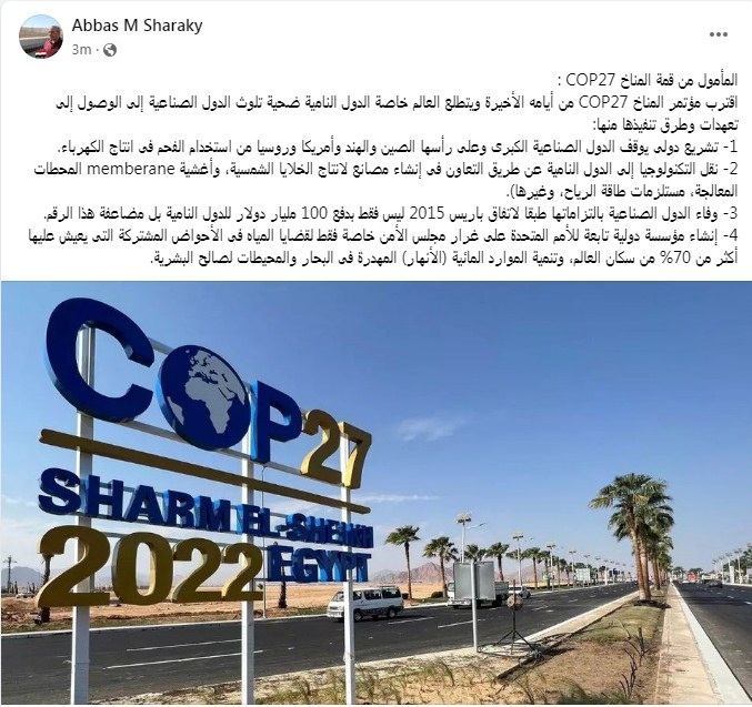 وكتب الدكتور عباس شراقي تدوينة على الفيس بوك "المأمول من قمة المناخ COP 27: اقترب مؤتمر المناخ COP 27 من أيامه الأخيرة ويتطلع العالم خاصة الدول النامية ضحية تلوث الدول الصناعية إلى الوصول إلى تعهدات".