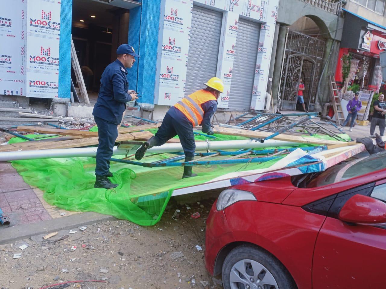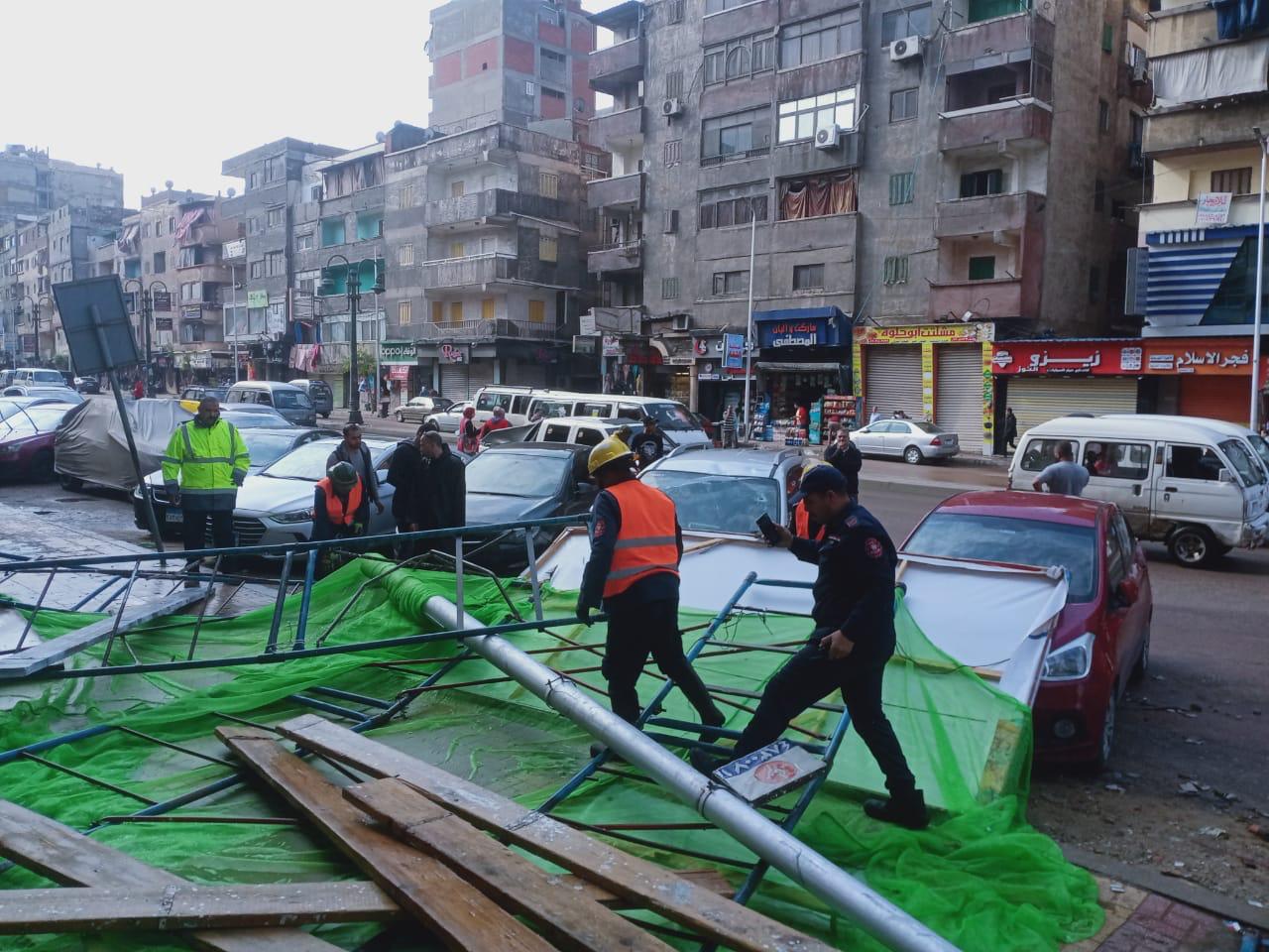 كما سقط عمود إنارة بنفس الطريق، وجري رفعه علي الفور من إدارة كهرباء حي العجمي وتأمين مكانه مع التأكد من باقي الاعمده وعزلها.