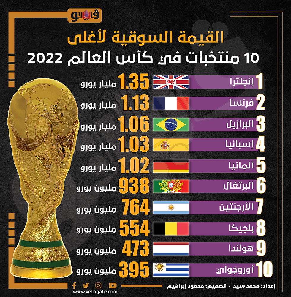 القيمة السوقية لأغلى 10 منتخبات في كأس العالم 2022 | إنفوجراف الإثنين 14/نوفمبر/2022 - 08:13 م 11/14/2022 8:13:45 PM منتخب إنجلترا محمد سيد شارك طباعة 18 حجم الخط شارك طباعة البرازيل البرتغال اسبانيا ألمانيا إنجلترا بلجيكا فرنسا كأس العالم كأس العالم 2022 كأس العالم قطر 2022