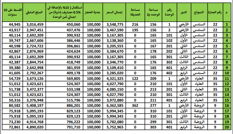 وحددت كراسة الشروط أسعار الشقق وتبدأ من 3.109 مليون جنيه بمساحة 165 مترا وتصل لـ6.36 مليون جنيه بمساحة 277 متر مربع وحديقة 362 مترا، وأسعار الشقق بالكامل كالتالي: