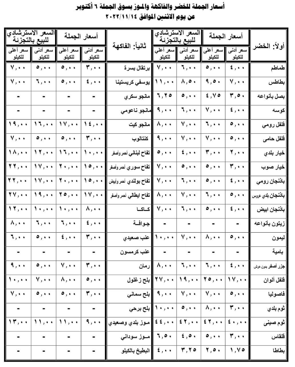 وسجلت أسعار الفلفل الألوان ما بين 3 و7 جنيهات، وسجل كيلو القلقاس من 3 إلى 6 جنيهات، وبلغ سعر الثوم من 7 إلى 11 جنيها، وسعر خس كابوتشي 4.50 جنيه.
