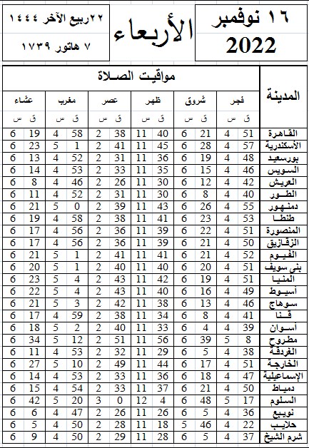 مواقيت الصلاة اليوم وفقًا للتوقيت المحلي لمدينتي القاهرة والإسكندرية وعدد من مدن ومحافظات الجمهورية من واقع بيانات الهيئة العامة للمساحة