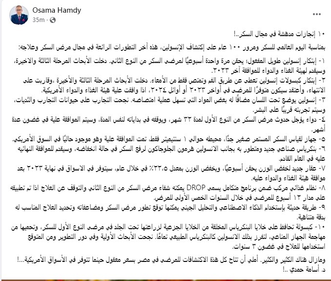 وكتب الدكتور أسامة حمدي تدوينة على الفيس بوك "١٠ إنجازات مدهشة في مجال السكر. بمناسبة اليوم العالمي للسكر ومرور ١٠٠ عام على اكتشاف الإنسولين، هذه آخر التطورات الرائعة في مجال مرض السكر وعلاجه".