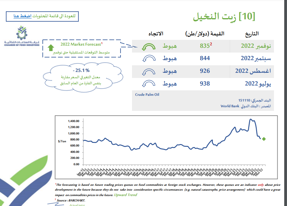 أكد تقرير السلع الغذائية العالمية الصادر عن غرفة الصناعات الغذائية باتحاد الصناعات، أنه من المتوقع تراجع سعر زيت النخيل خلال نوفمبر ليصل إلى 835 دولارًا للطن.