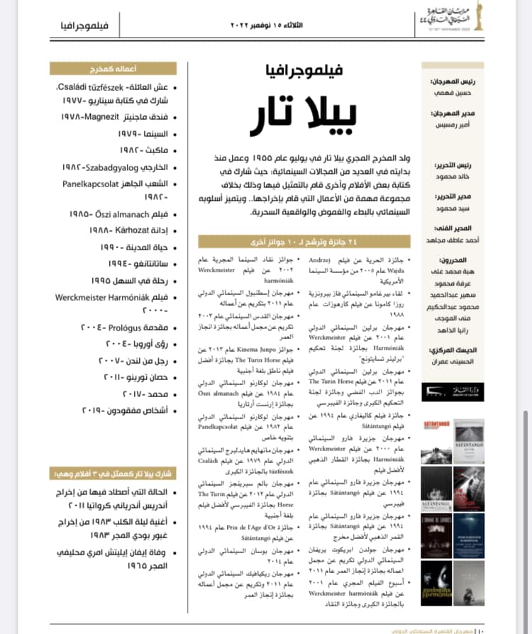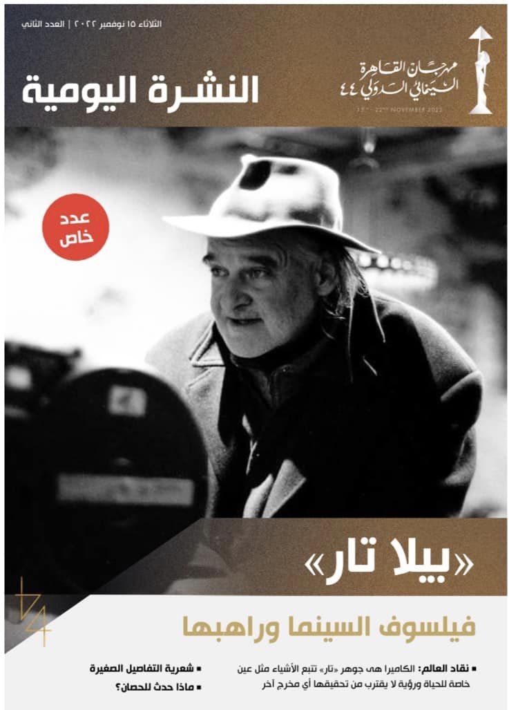 أطلقت الدورة الـ 44 من مهرجان القاهرة السينمائي الدولي إصدارا ثقافيا خاصا بالمخرج المجري الشهير “بيلا تار” الحاصل على جائزة الهرم الذهبي لإنجاز العمر من المهرجان.