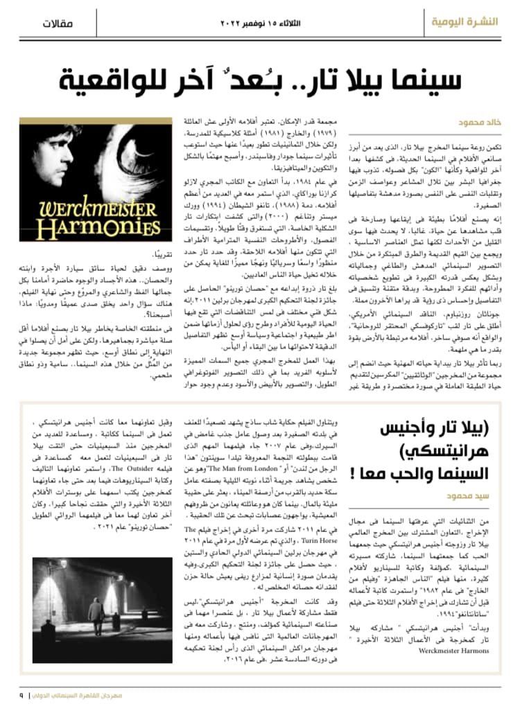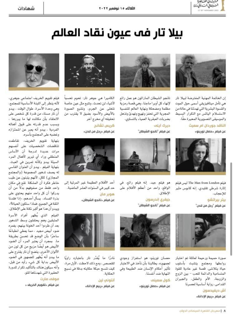 وفي البداية أعرب "تار" عن سعادته بتكريمه في الدورة الـ44 من مهرجان القاهرة السينمائي الدولي، وعرض فيلمه "Harmonies "Werckmeister خلال الفعاليات.