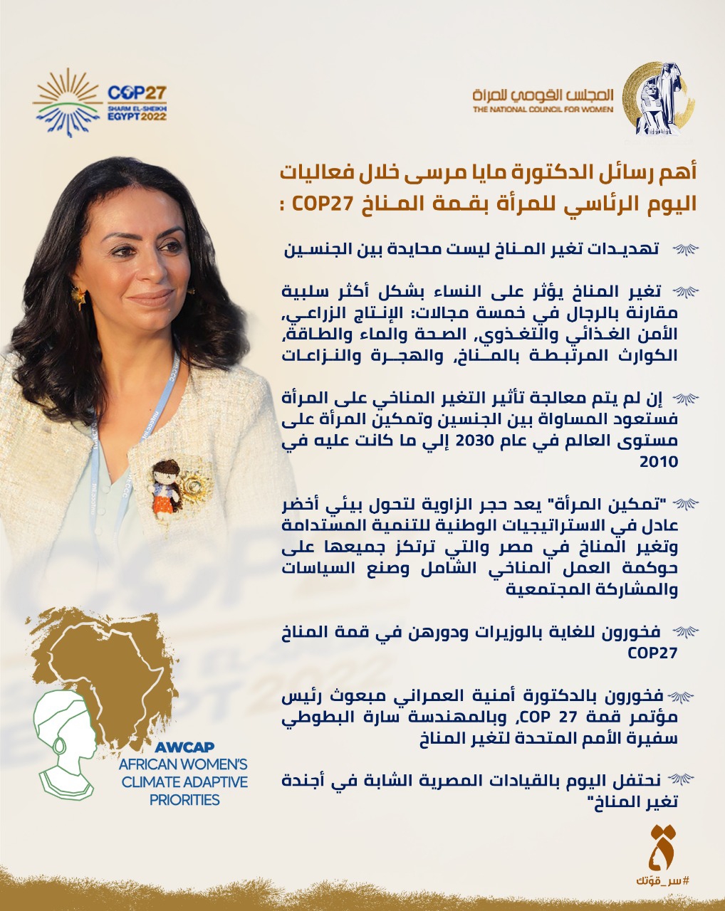 وتستعرض الصور التالية أبرز ما جاء فى كلمة الدكتورة مايا مرسى رئيسة المجلس القومى للمرأة خلال الجلسة الافتتاحية لليوم الرئاسى للمرأة _ Gender Day ضمن فعاليات قمة المناخ cop27.