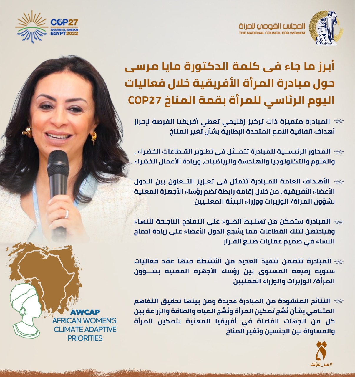 وأضافت رئيسة المجلس أن المرأة الأفريقية عامل تغيير رئيسي في هذه الأزمة العالمية، وفى الانتقال السليم والفعال وتسريع تحقيق أجندة التنمية المستدامة لتصميم وتنفيذ التكيف الفعال، والإستراتيجية الوطنية لتغير المناخ 2050، وشددت على أهمية المساهمة المالية في دعم المرأة والفتيات، وترجمة جميع السياسات إلى واقع ملموس بالتنفيذ.