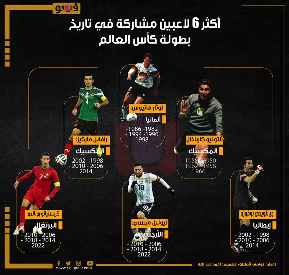 أكثر 6 لاعبين مشاركة في تاريخ بطولة كأس العالم | إنفوجراف الخميس 17/نوفمبر/2022 - 06:22 م 11/17/2022 6:22:17 PM كريستيانو رونالدو وليونيل ميسي يوسف شعبان شارك طباعة 18 حجم الخط شارك طباعة كأس العالم ماتيوس رافايل ماركيز جانلويجي بوفون ميسي رونالدو