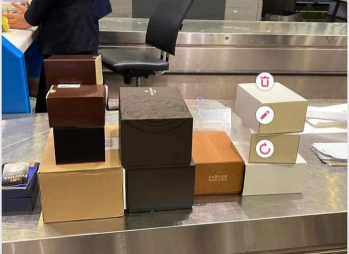 وبالعرض على محمود عبد النبي مدير الإدارة بالإنابة، قام بتكليف أحمد محمد فوزي مدير إدارة الحركة، وأحمد فؤاد ومحمود مصطفي مأموري الجمرك، بتفتيش حقائب الركب وتفتيشه ذاتيا فتبين وجود عدد من علب الساعات الفارغة داخل حقائبه ووجود 7 ساعات ماركة rolex باهظة الثمن مخبأة داخل جيوب البنطلون الذي يرتديه .