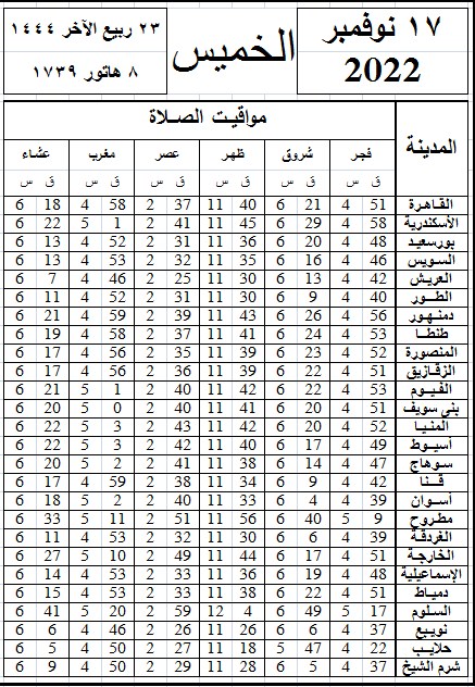مواقيت الصلاة اليوم وفقًا للتوقيت المحلي لمدينتي القاهرة والإسكندرية وعدد من مدن ومحافظات الجمهورية من واقع بيانات الهيئة العامة للمساحة