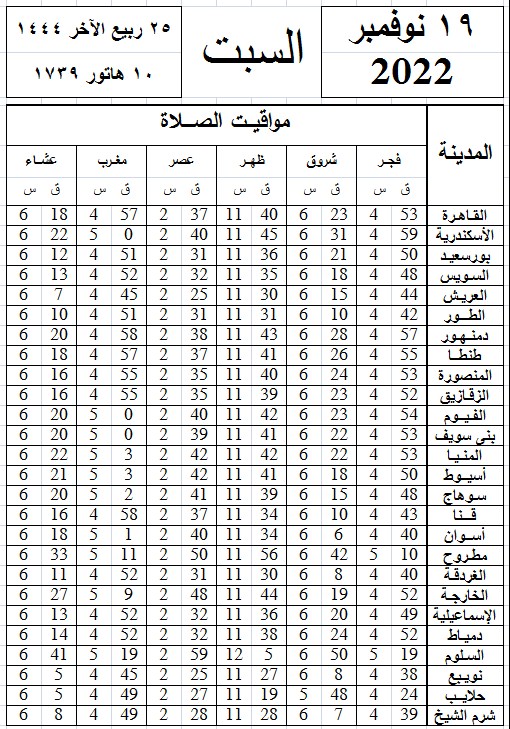 مواقيت الصلاة اليوم وفقًا للتوقيت المحلي لمدينتي القاهرة والإسكندرية وعدد من مدن ومحافظات الجمهورية من واقع بيانات الهيئة العامة للمساحة