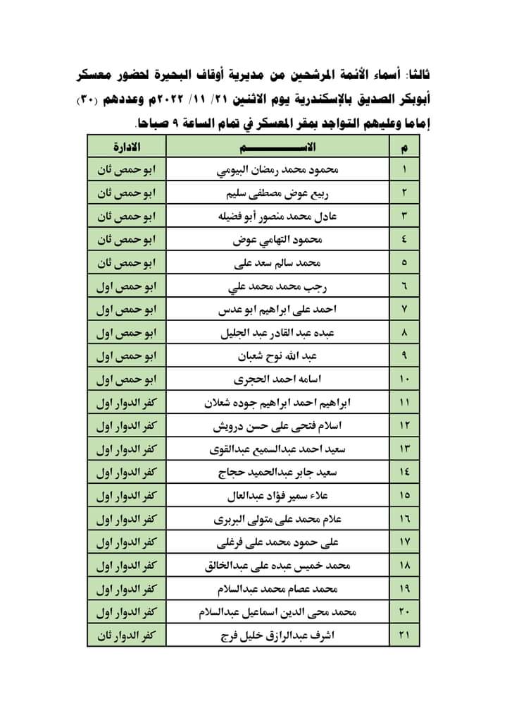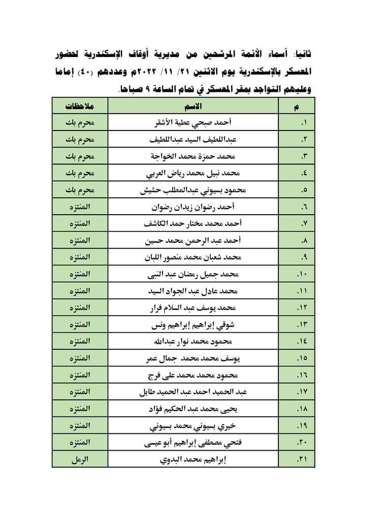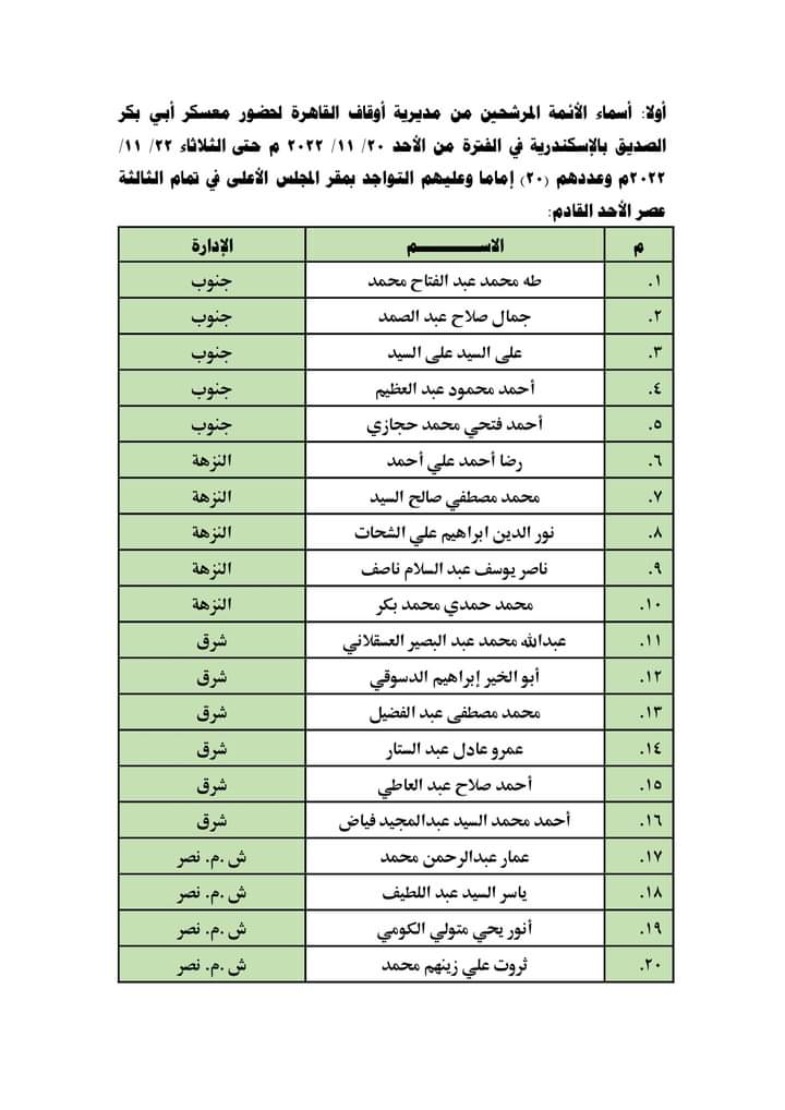 وأكدت الأوقاف أن السفر إلى الإسكندرية في تمام الساعة الثالثة عصر يوم الأحد 20 / 11 / 2022م من أمام المجلس الأعلى بالنسبة لأئمة أوقاف القاهرة والطلاب الوافدين، أما باقي الأئمة المشاركين من مديرتي أوقاف البحيرة والإسكندرية فعليهم التواجد بمقر المعسكر في تمام الساعة التاسعة صباح يوم الاثنين 21 نوفمبر 2022م.