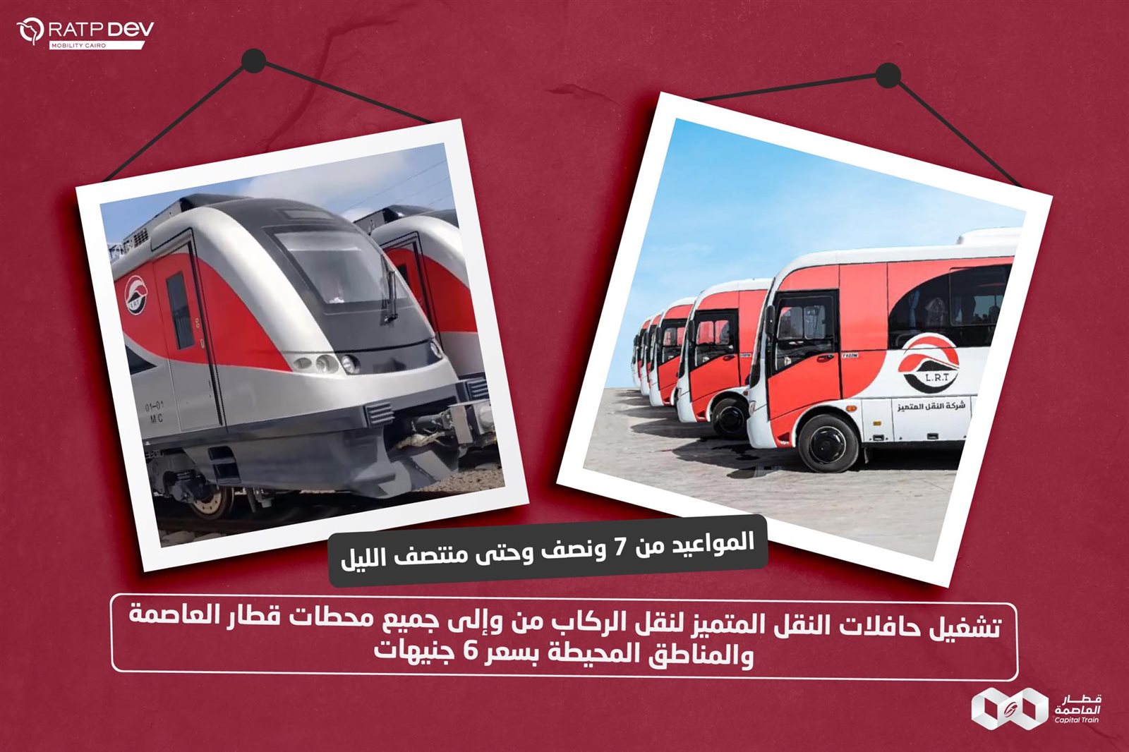 وتشمل الخدمة الجديدة توفير باصات مكيفة من العديد من المدن القريبة من محطات القطار لنقل الركاب إلى اقرب محطة لتشجيع المواطنين على استقلال القطار وتأتي هذة الخطوة لتعظيم استفادة قاطني المدن الجديدة من الحصول على خدمات قطار العاصمة (مشروع القطار الكهربائي الخفيف) تم تشغيل حافلات خاصة ومكيفة لنقل الركاب من محطات قطار العاصمة إلى مدينة العبور، الشروق، هليوبوليس الجديدة، بدر، والعاشر من رمضان والعكس. وتعمل الحافلات من الساعة 7:30 صباحًا حتى 12 منتصف الليل، بمعدل حافلة كل 20 دقيقة وبسعر 6 جنيهات. للمزيد من المعلومات، الرجاء التواصل معنا عبر 19549.
