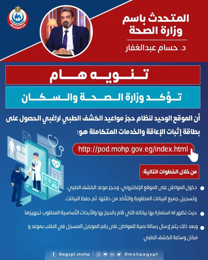 أكد الدكتور حسام عبد الغفار المتحدث باسم وزارة الصحة أن الموقع الوحيد لنظام حجز مواعيد الكشف الطبي لراغبي الحصول على بطاقة إثبات الإعاقة والخدمات المتكاملة من خلال الموقع التالي.