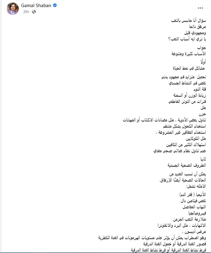 وردًا على سؤال الشعور بالتعب، والإرهاق الدائم، برغم قلة المجهود قال جمال شعبان، عبر صفحته بالفيس بوك: "الأسباب كثيرة ومتنوعة.. أولًا مشاكل في نمط الحياة.. تحميل متزايد في مجهود بدني.. نقص في النشاط الجسدي، قلة النوم، زيادة الوزن أو السمنة، فترات من التوتر العاطفي، ملل، حزن، تناول بعض الأدوية، مثل مضادات الاكتئاب أو المهدئات، استخدام الكحول بشكل منتظم، استخدام العقاقير غير المشروعة، مثل الكوكايين، استهلاك الكثير من الكافيين، عدم تناول نظام غذائي صحي مغذي".