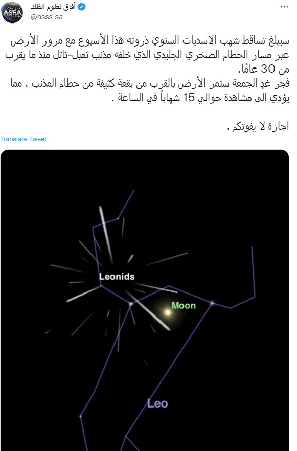 وكتبت آفاق لعلوم الفلك تغريدة على تويتر "سيبلغ تساقط شهب الاسديات السنوي ذروته هذا الأسبوع مع مرور الأرض عبر مسار الحطام الصخري الجليدي الذي خلفه مذنب تمبل-تاتل منذ ما يقرب من 30 عامًا."
