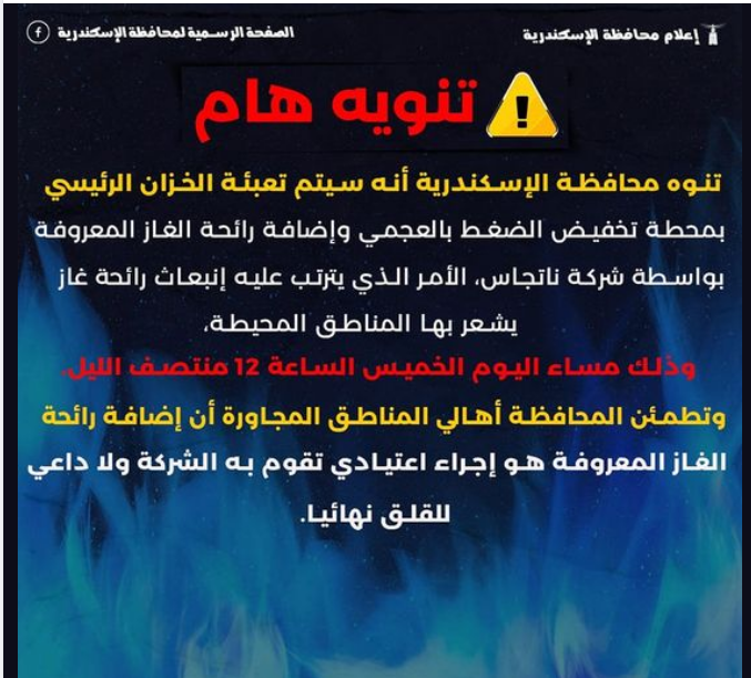 أصدرت محافظة الإسكندرية، بيانًا بشأن احتمال انتشار رائحة غاز في شوارع المدينة الساحلية، موجهة رسالة عاجلة للمواطنين.