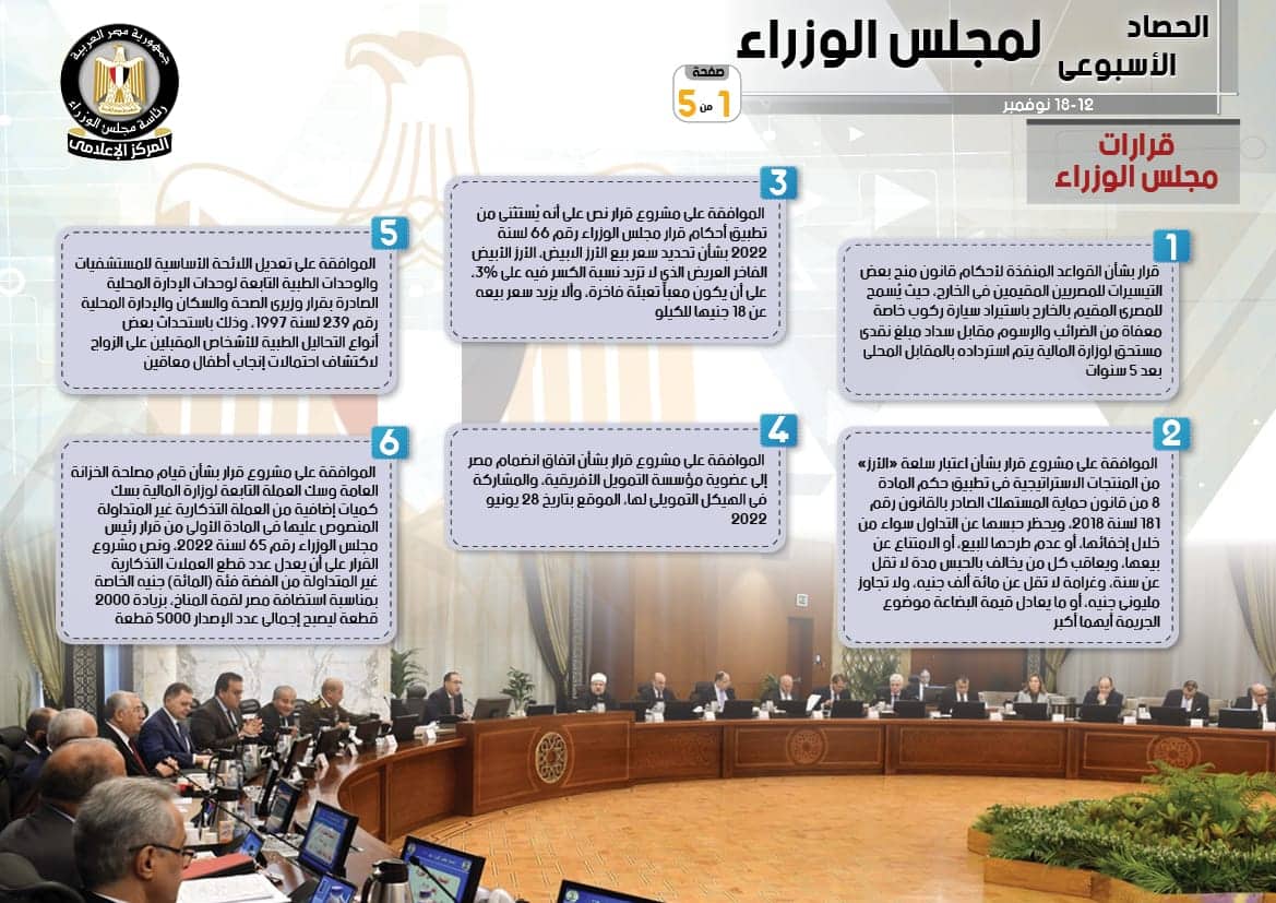 وجاء في التقرير أنه تم إصدار عدد من القرارات، تشمل الموافقة على قرار بشأن القواعد المنفذة لأحكام قانون منح بعض التيسيرات للمصريين المقيمين في الخارج، حيث يُسمح للمصري المقيم بالخارج باستيراد سيارة ركوب خاصة معفاة من الضرائب والرسوم مقابل سداد مبلغ نقدي مستحق لوزارة المالية يتم استرداده بالمقابل المحلي بعد 5 سنوات، فضلًا عن الموافقة على مشروع قرار بشأن اعتبار سلعة "الأرز" من المنتجات الاستراتيجية في تطبيق حكم المادة 8 من قانون حماية المستهلك الصادر بالقانون رقم 181 لسنة 2018، ويحظر حبسها عن التداول سواء من خلال إخفائها، أو عدم طرحها للبيع، أو الامتناع عن بيعها، ويعاقب كل من يخالف بالحبس مدة لا تقل عن سنة، وغرامة لا تقل عن مائة ألف جنيه، ولا تجاوز مليوني جنيه، أو ما يعادل قيمة البضاعة موضوع الجريمة أيهما أكبر.