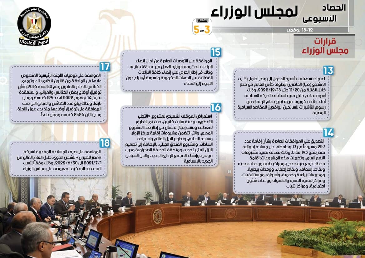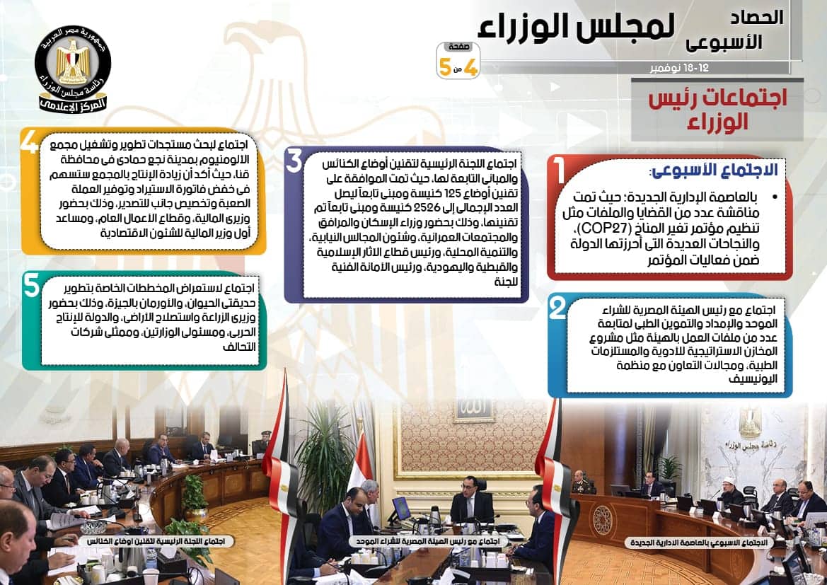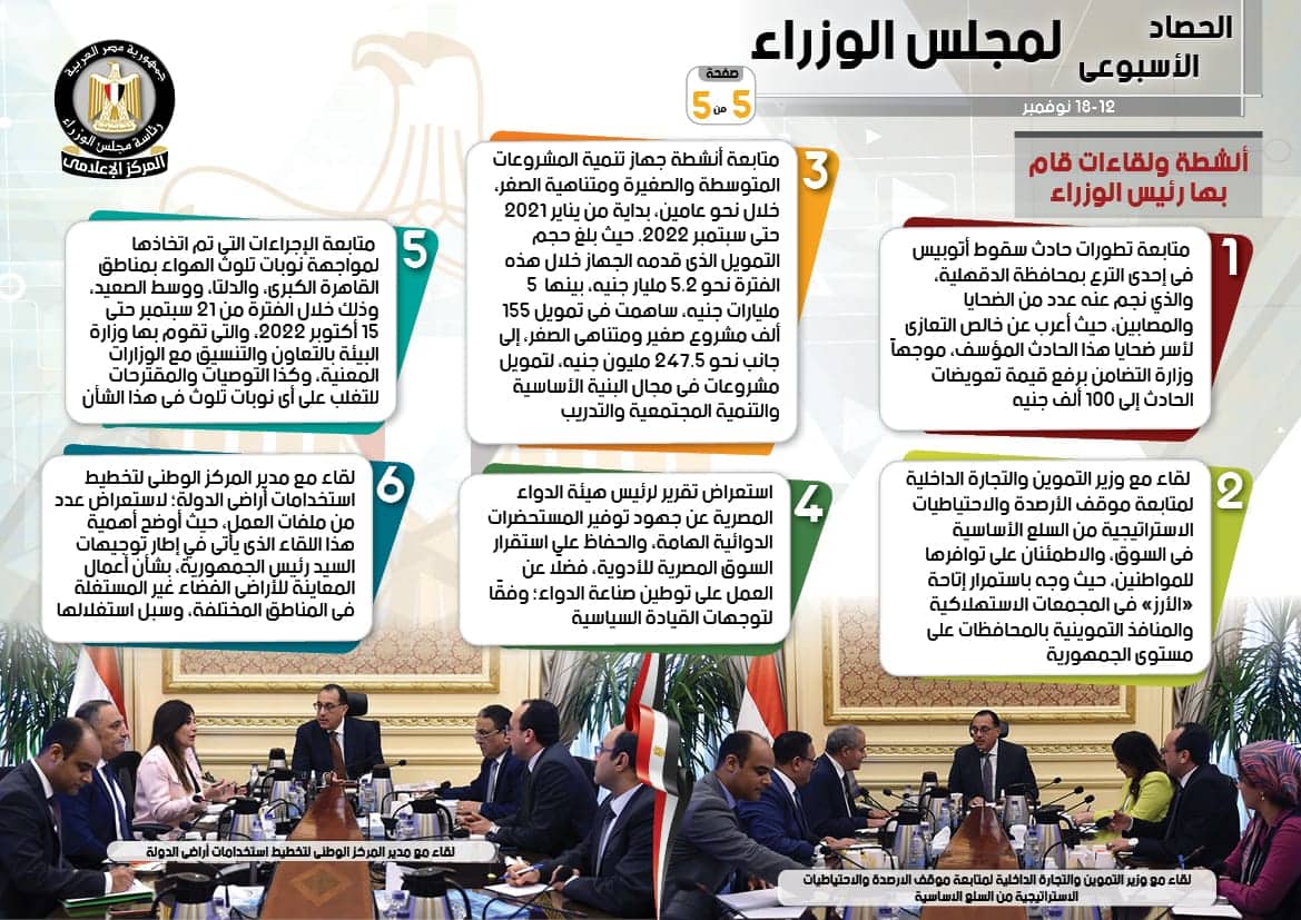 نشر المركز الإعلامي لمجلس الوزراء، تقريرًا شمل إنفوجرافات سلط من خلالها الضوء على الحصاد الأسبوعي لمجلس الوزراء، وذلك خلال الفترة من12 حتى 18 نوفمبر 2022، والذي تضمن الموافقة على عدد من القرارات، فضلًا عن الاجتماعات واللقاءات التي عقدها الدكتور مصطفى مدبولي، رئيس مجلس الوزراء، بالإضافة إلى ما قام به من أنشطة.
