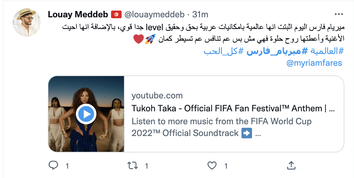 نجحت المطربة اللبنانية ميريام فارس، في تحويل الهجوم الذي تعرضت له منذ يومين، لاعجاب وفخر، ومساندة، خاصًة بعد دخولها التاريخ كأول فنانة عربية تحتل المركز الأول في iTunes أمريكا، بعد تصدرت أغنية كأس العالم ٢٠٢٢ Tukoh Taka القائمة بعد ساعات من طرحها رسميًّا من قبل الفيفا.