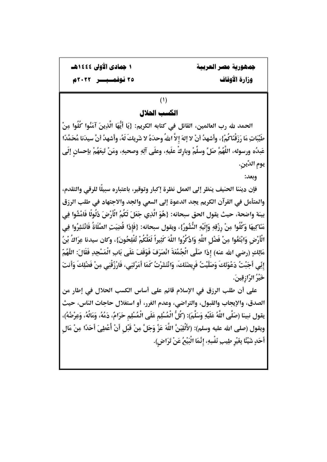 نشرت وزارة الأوقاف موضوع خطبة الجمعة القادمة ١ جمادى الأول ١٤٤٤هــ الموافق ٢٥ نوفمبر ٢٠٢٢م، تحت عنوان: "الكسب الحلال".
