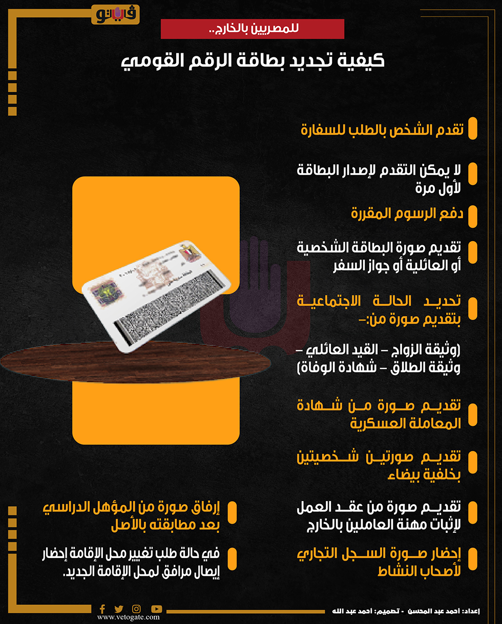 للمصريين بالخارج.. كيفية تجديد بطاقة الرقم القومي | انفوجراف الأحد 20/نوفمبر/2022 - 12:22 م 11/20/2022 12:22:53 PM السفارة المصرية أحمد عبدالمحسن شارك طباعة 18 حجم الخط شارك طباعة البطاقة الشخصية الاحوال المدنية العاملين بالخارج السجل التجاري بطاقة الرقم القومى مصلحة الاحوال المدنية