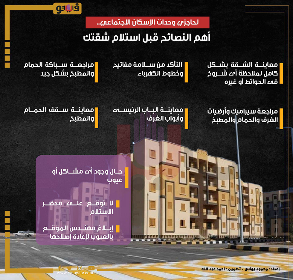 لحاجزي وحدات الإسكان الاجتماعي.. أهم النصائح قبل استلام شقتك | انفوجراف الأحد 27/نوفمبر/2022 - 10:46 ص 11/27/2022 10:46:43 AM شقق الاسكان محمود يونس شارك طباعة 18 حجم الخط شارك طباعة شقق وزارة الاسكان شقق الاسكان وزارة الاسكان أخبار العقارات
